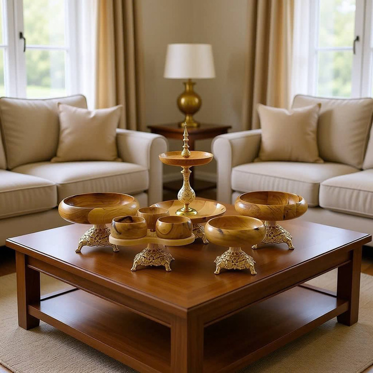 سرویس پذیرایی چوب گردو دارای پایه فلزی قلم کاری شده در دورنگ کرم-طلایی و مشکی- طلایی